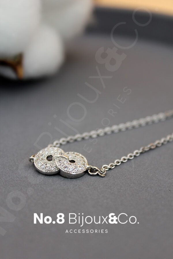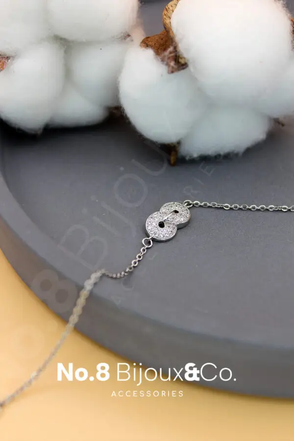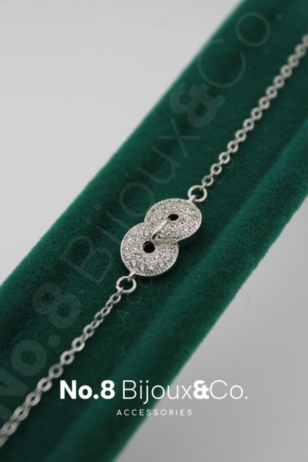 Xuping’in sade ama etkileyici tasarım çizgisini taşıyan bu çift halka pave taşlı bileklik, beyaz altın görünümü ve parıltılı zirkon detaylarıyla bilekte zarif bir ışık yansıması oluşturur. İki halka formunun birbirine geçmeli kullanımı, bağlılık, bütünlük ve bir aradalığı temsil ederken; modern ve minimal formu sayesinde her stile kolaylıkla uyum sağlar. 18+3 cm ayarlanabilir zincir yapısı, bileğe tam oturan konforlu bir kullanım sunar. Günlük kullanım için hafif, özel günler için ise yeterince göz alıcıdır. Bu tasarım aynı zamanda No.8 Bijoux&Co. markasının adındaki “8” sembolünün süreklilik ve akışkanlık anlamıyla uyumlu bir form taşır. İki halkanın birleşimi, tıpkı “8” karakterinin kesintisiz döngüsü gibi zarafetin devamlılığını simgeler.