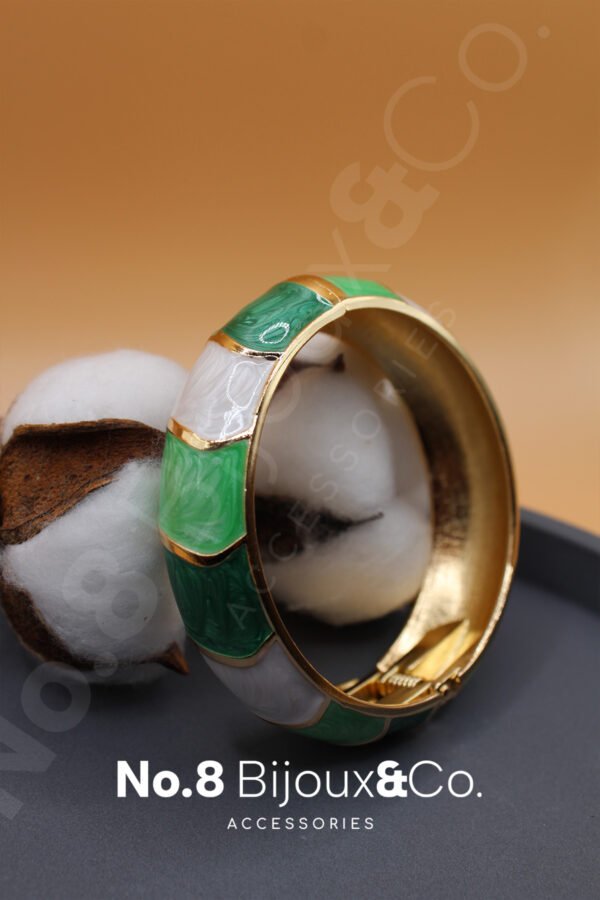 No.8 Bijoux&Co. ’nun özel koleksiyonundan bu zarif mineli bilezik, beyaz ve yeşil tonlarının huzur veren geçişini altın ışıltısıyla birleştirir. Günlük stilinize zarif bir dokunuş katarken, özel davetlerde de sofistike bir tamamlayıcı olarak öne çıkar. Gold kaplama pirinç yüzeyi sayesinde uzun ömürlü parlaklık sağlar.