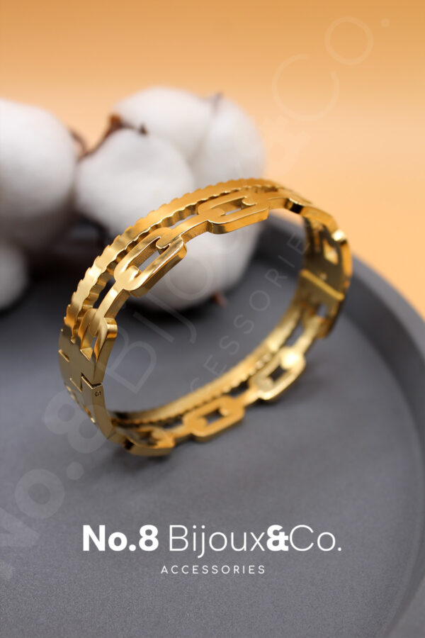 Paslanmaz Çelik Altın Rengi Çift Sıra Zincir Form Detaylı Modern Bilezik (6 Cm Oval İç Genişlik)