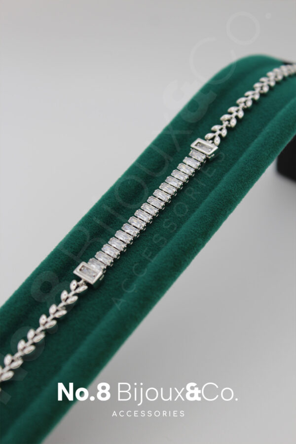 Merkezde yer alan ışıltılı baget taş dizilimi, bilekte dikkat çekici bir parıltı oluştururken; yaprak formundaki ince zincir, tasarıma hem romantik hem de zarif bir karakter kazandırıyor.