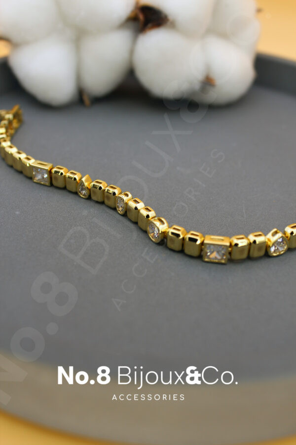 Zarif dizilmiş yuvarlak, kare ve damla formlu zirkon taşların bir araya geldiği bu özel tasarım bileklik; ışıltısı, modern hatları ve şık görünümüyle gündelik ve özel davet kombinlerinin tamamlayıcısıdır. Altın görünümü sayesinde yüksek şıklık sunarken, Xuping kalitesi ile uzun ömürlü kullanım sağlar.