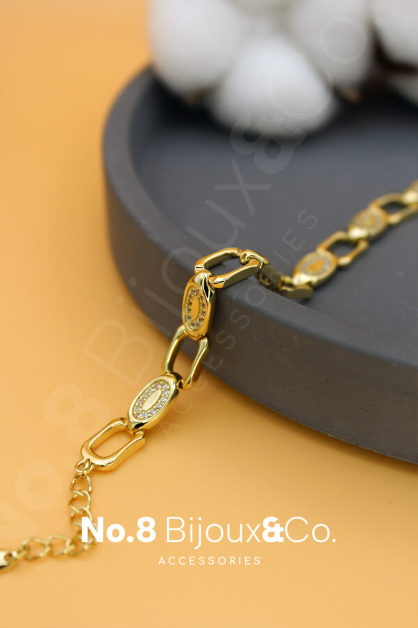 Zarif oval taş detaylarıyla modern bir görünüm sunan bu Xuping bileklik, 14K altın görünümüyle bilekte sofistike bir ışıltı oluşturur. Oval pave motifler, zincir halkalarla kusursuz bir ritim içinde birleşerek güçlü ama zarif bir duruş sergiler. 17+2,5 cm ayarlanabilir yapısı sayesinde farklı bilek ölçülerine uyum sağlar. Günlük kullanımda hafifliğiyle konfor sunarken, akşam kombinlerinde de elegan bir tamamlayıcı olarak öne çıkar.